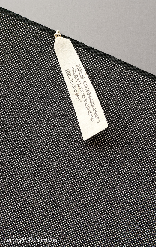『行儀小紋』は、丸型の"点"が斜めに並べられた柄模様です。こちらに掲載をさせて頂いた江戸小紋は、その『行儀』の中でも、特に細密な「生の伊勢型紙」を使い染められています。