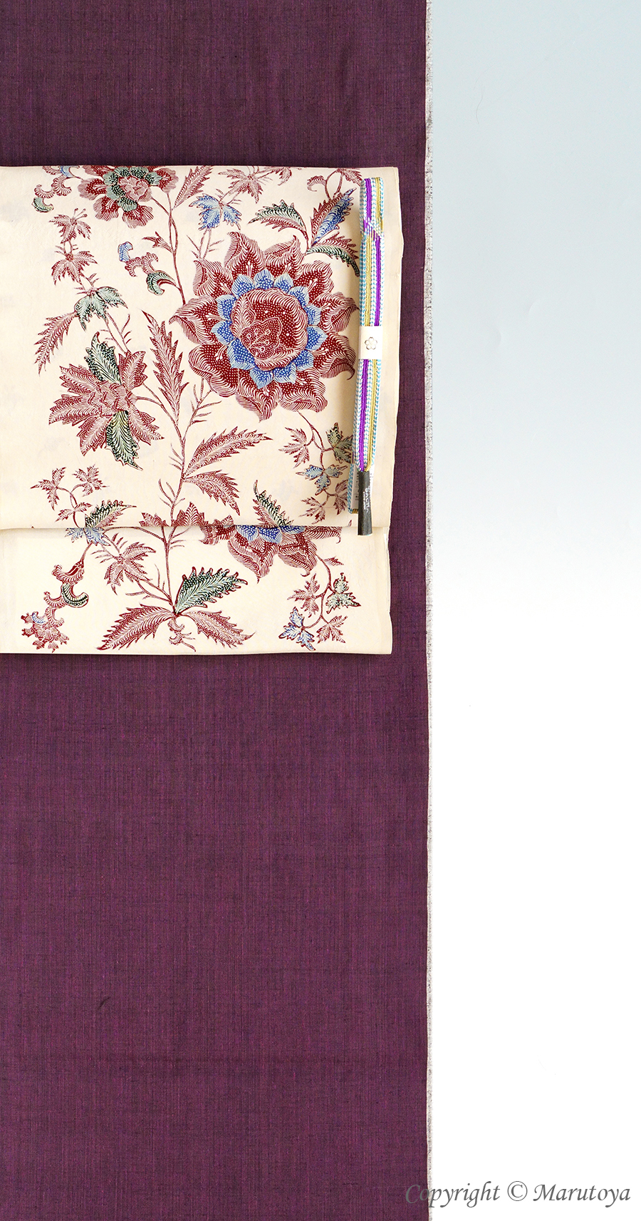 Reisia手描きジャワ更紗染帯『Flower of Chinoigerie』の着物あわせ