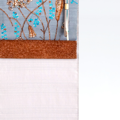 この作品からは、刷毛や筆では表現出来ない質感が伝わって来ます。ドライフラワーは、制作者特有の細密な"筒描き"で実現され、"染めた"感じとは一線を画した絵画的な空気に包まれています。香しい美的感性を想像させてくれます。
