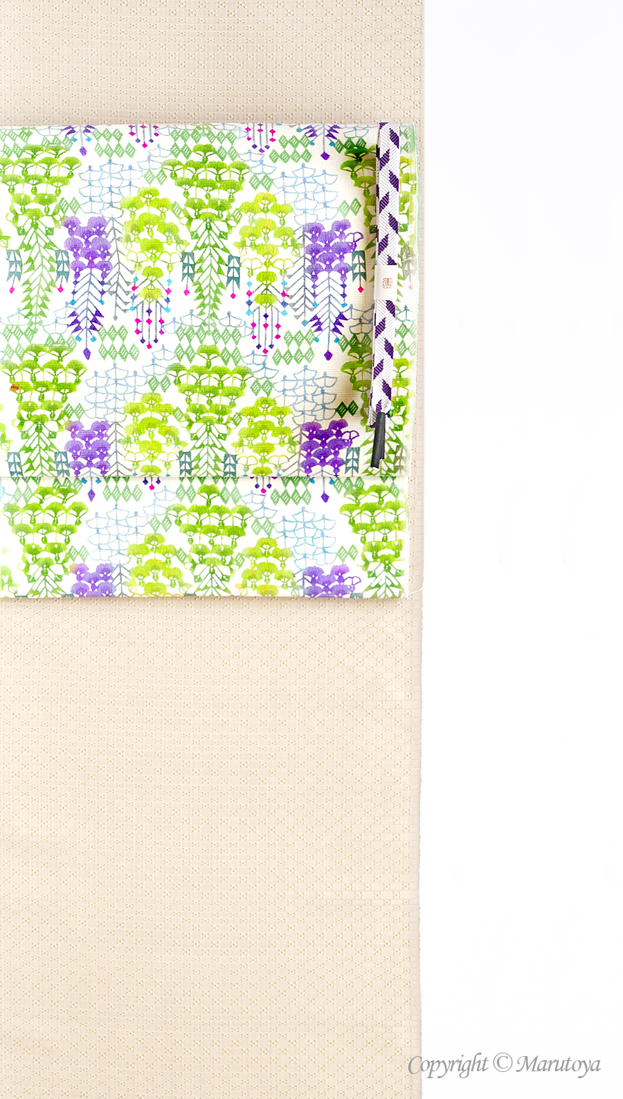 淡い生成りの地に、若葉の黄緑と紫の房がたおやかにと垂れ、ところどころに灯る小さな紅が雫(しずく)のように煌めくように映っています。また、描かれた藤には、はわずかに歪んいるように描かれている藤もみられます。それは風に揺れる藤の光景、咲き乱れる藤には同じ姿はないことを暗示しているかのようです。