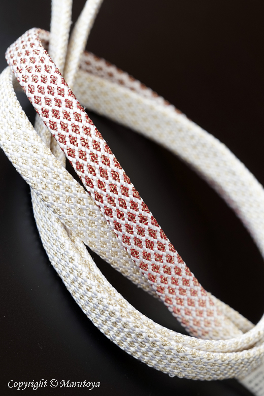 こちらに掲載をさせて頂いた内記組には、金糸と染め糸を細密な菱型に組み込んでいます。そのため、白い絹の組紐の中に、まるで金や色の欠片(かけら)が鏤められている様に見えます。また、欠片が片側だけ染め暈かすことで、すっきりとしたイメージの中にも軽いカラーアクセントが生まれ、綺麗に仕上げられています。