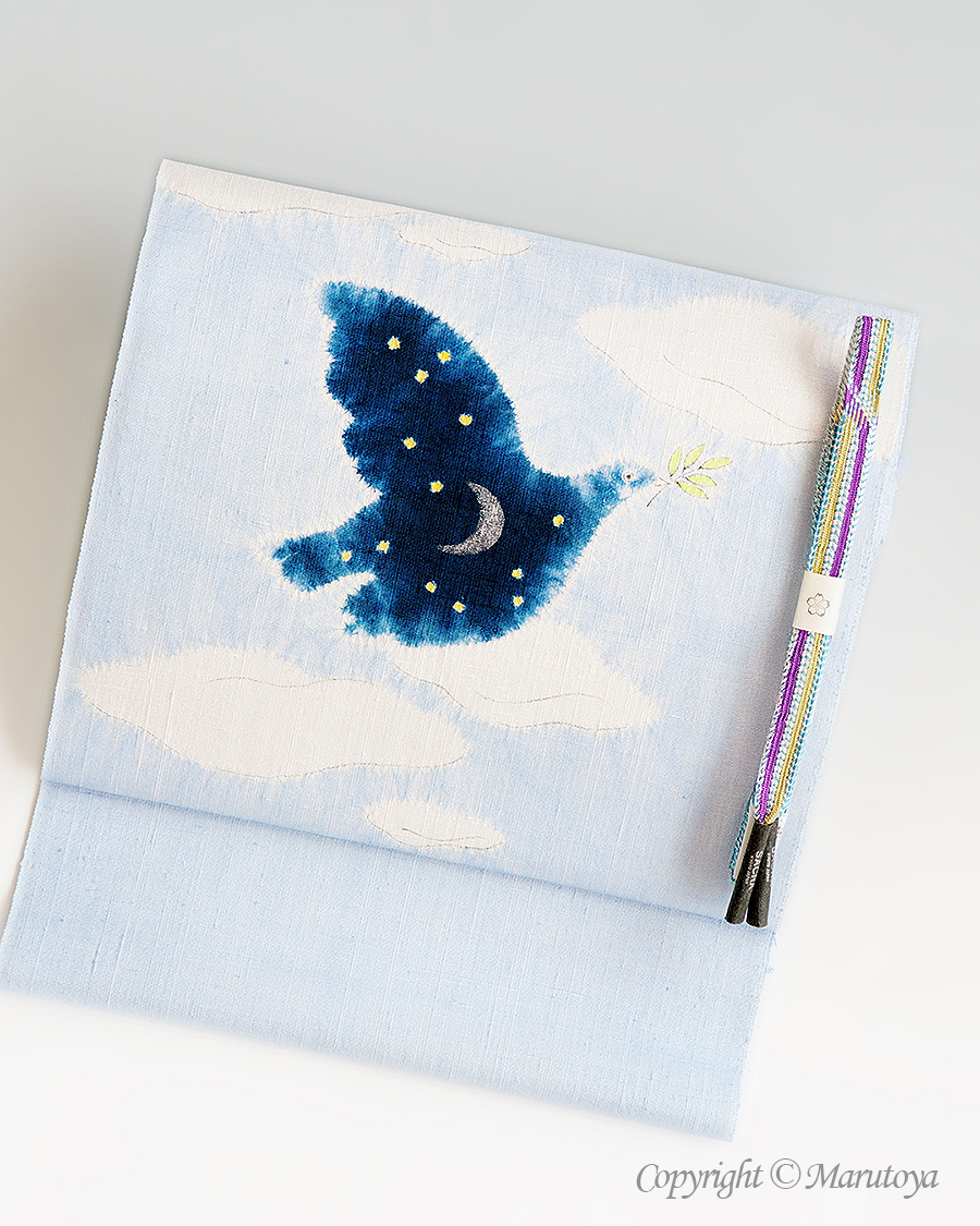 けれども、この帯を見ていると不思議な感覚が憶えるかもしれません。オリーブを咥えた鳥は、夜空を暗示するかのような彩色が施され、銀色の月が描かれています。まるで、そこには解き放たれたイメージとは違う空間が覗いているようです。
