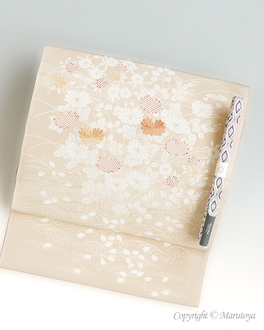 淡いブラウン系の色彩を背景に、菊に萩と流水、そして、桜が描かれています。