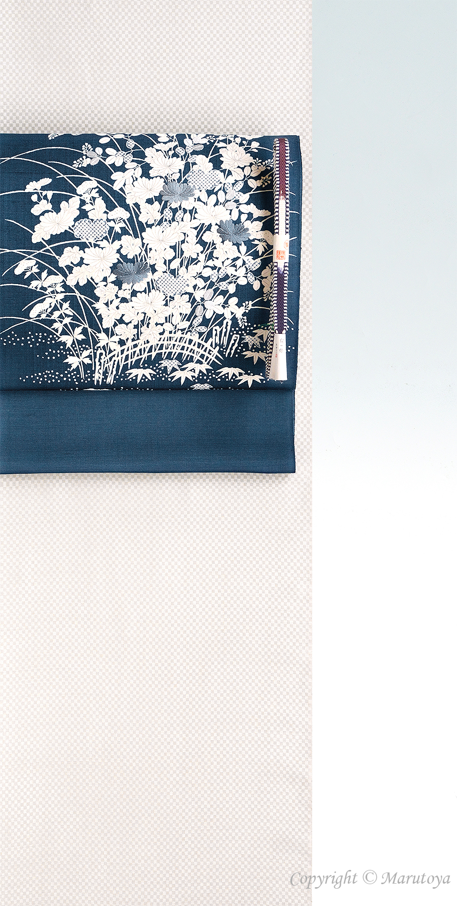 紬生地にネイビー系で彩色された御所解模様は、艶やかなカラーイメージの御所解では馴染み難かった着物とのコーディネート(着物あわせ)が出来ます。シンプルで落ち着いた着物、例えば、穏やかな色彩の手織紬、落ち着いた色の江戸小紋などの着物とあわせたとしても、御所解模様が伝える宮廷的な空気感によって、これまでにない着こなしが期待出来ます。