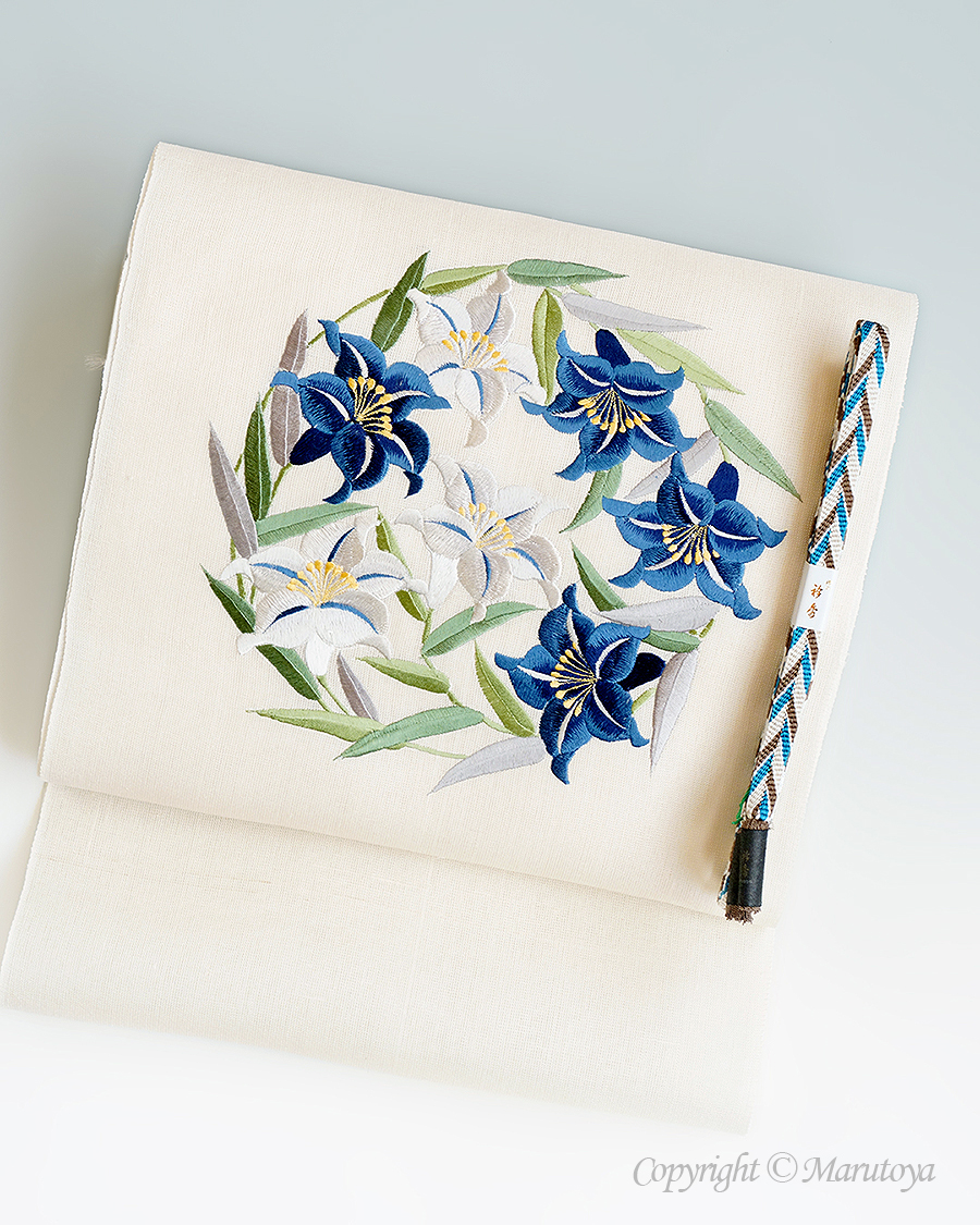 夏を彩る百合の花をモチーフにデザインされた刺繍の九寸名古屋帯。