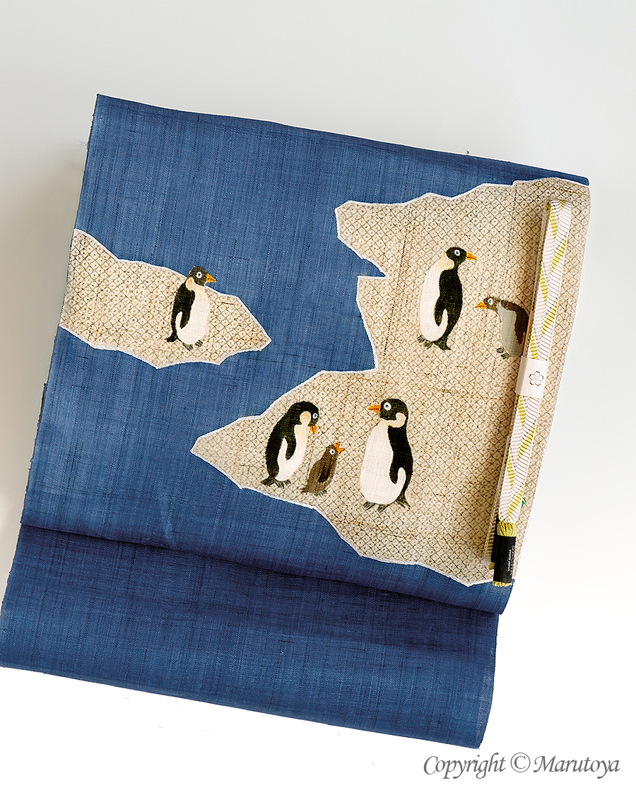 ペンギンと南極(?)をモチーフに描かれた麻の染め帯です。