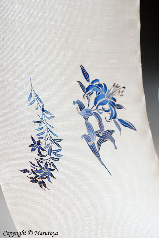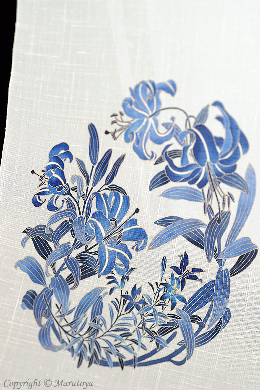 染め描かれているのは..、夏季の花。テーマは夏百合...、ただ、写実的に描くのではなくて、巧みに図案化され、藍一色で染め描き切っています。