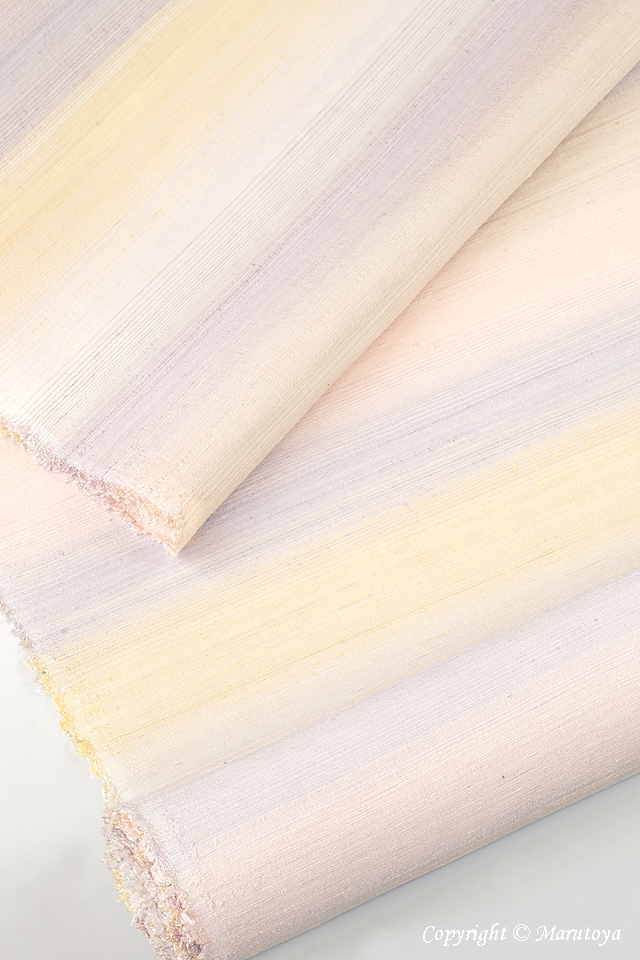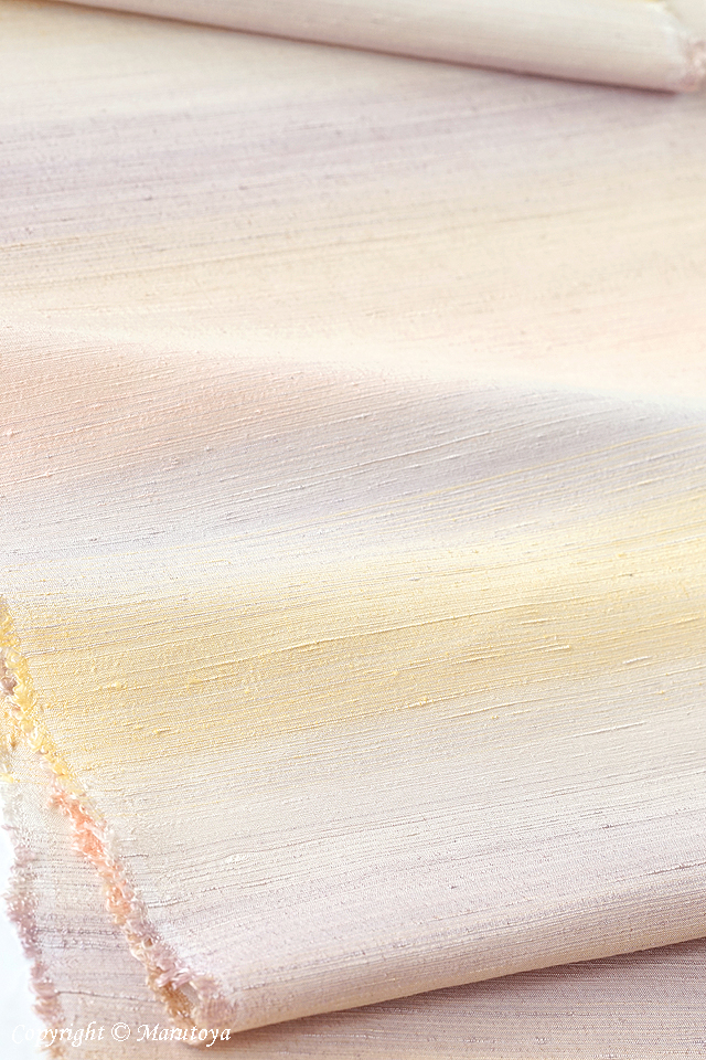 絹の美しさ、柔らかさをそのまま織物にしたかの様な素材感に満ちています。まるで繭を羽織るイメージを求めつくられているかの様で、人間の手が掛けられているにも関わらずとてもナチュラルで、無垢な美しさと艶感に覆われています。
