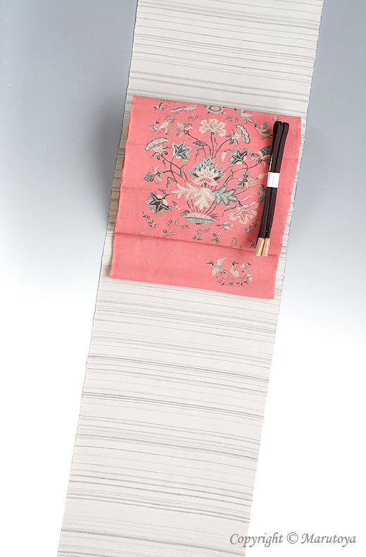 シンプルな色加減と緯段織であるけれど、眼に映る以上の色の気配が感じられる...、眼に映っている感じが見ている色と違うのです。色だけじゃなく、真綿紬の素材感と相俟って、眼に映る以上の存在感となって伝わってくる様です。