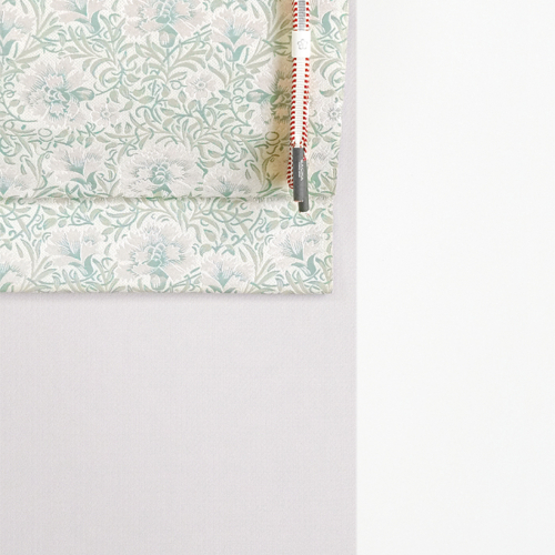 『カーネーション』をモチーフに描かれたこのデザインは、静まり返った夜明け頃の森を彷徨っているかのようなイメージを想わせてくれます。黄緑色の茎と葉が奏でる調べの中で、薄紅色のカーネーションが音色を響かせているようです。庭園文化への愛情がオーナメントされたデザインです。同じボタニカルアートでありながらも、更紗が伝える趣とは違うヨーロッパ装飾文化の薫りを伝えてくれます。