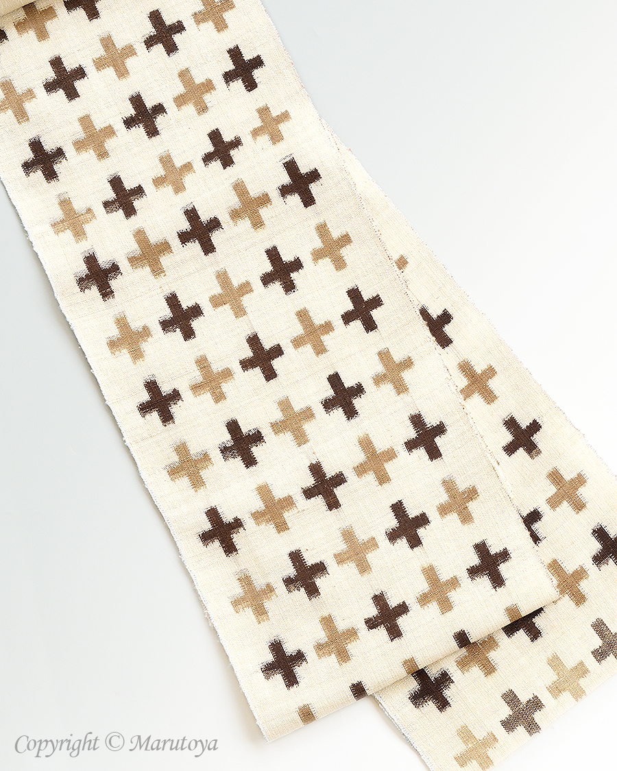 生成りの地に、まるで油彩で描かれたかのような十字のデザインが並び、北欧デザインを思わせるシンプルでモダンな雰囲気を醸し出しています。一方で、素朴で手仕事感のある絣の表情は、チベットの伝統的な絣染めをイメージさせ、オリエンタルな文化の香りも漂います。