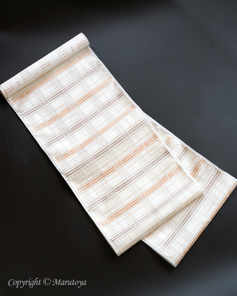 こちらに掲載をさせて頂いた「錦熨斗目」は、白を基調に、淡いベージュやグレー、柔らかな橙を織り込み、熨斗目の縞を格子状に構成されています。整然とした品格を保ちながらも、軽やかで都会的な印象を与えます。啓さん特有の生引き糸が生み出す艶や織の質感が光加減によって表情が移り変わることで、締めた姿に奥行きが表現されます。