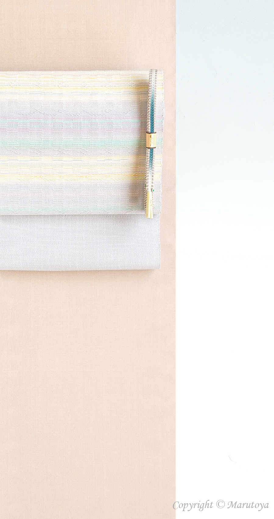 緯糸に織り込まれた道屯織には、淡いパステル調の彩りが美しいグラデーションとなって現れ、それはまるで沖縄の光や空、海の透明感を色の表情として映し出しているかのようです。