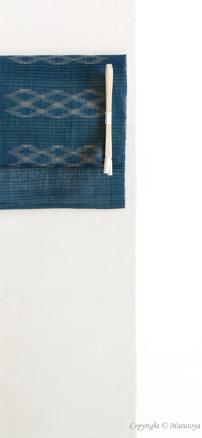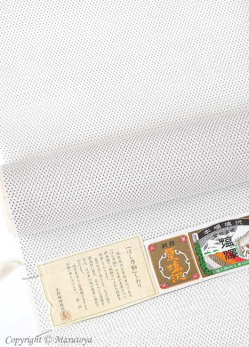 制作は、星野織物。経糸・緯糸、双方に駒撚りの強撚糸を使い夏塩沢特有の乾いた素材感がつくり出されています。この素材感は、蜻蛉の羽根を想わせるほどの繊細さを伝えています。また、麻織物にはない絹の薄機特有の艶感が、涼感を伴った綺麗さを感じさせてくれます。