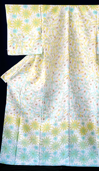 | 型絵染め絵羽『ミモザ』 制作:岩井香楠子 |
