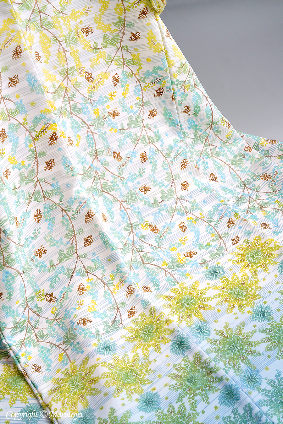 | 型絵染め絵羽『ミモザ』 制作:岩井香楠子 |